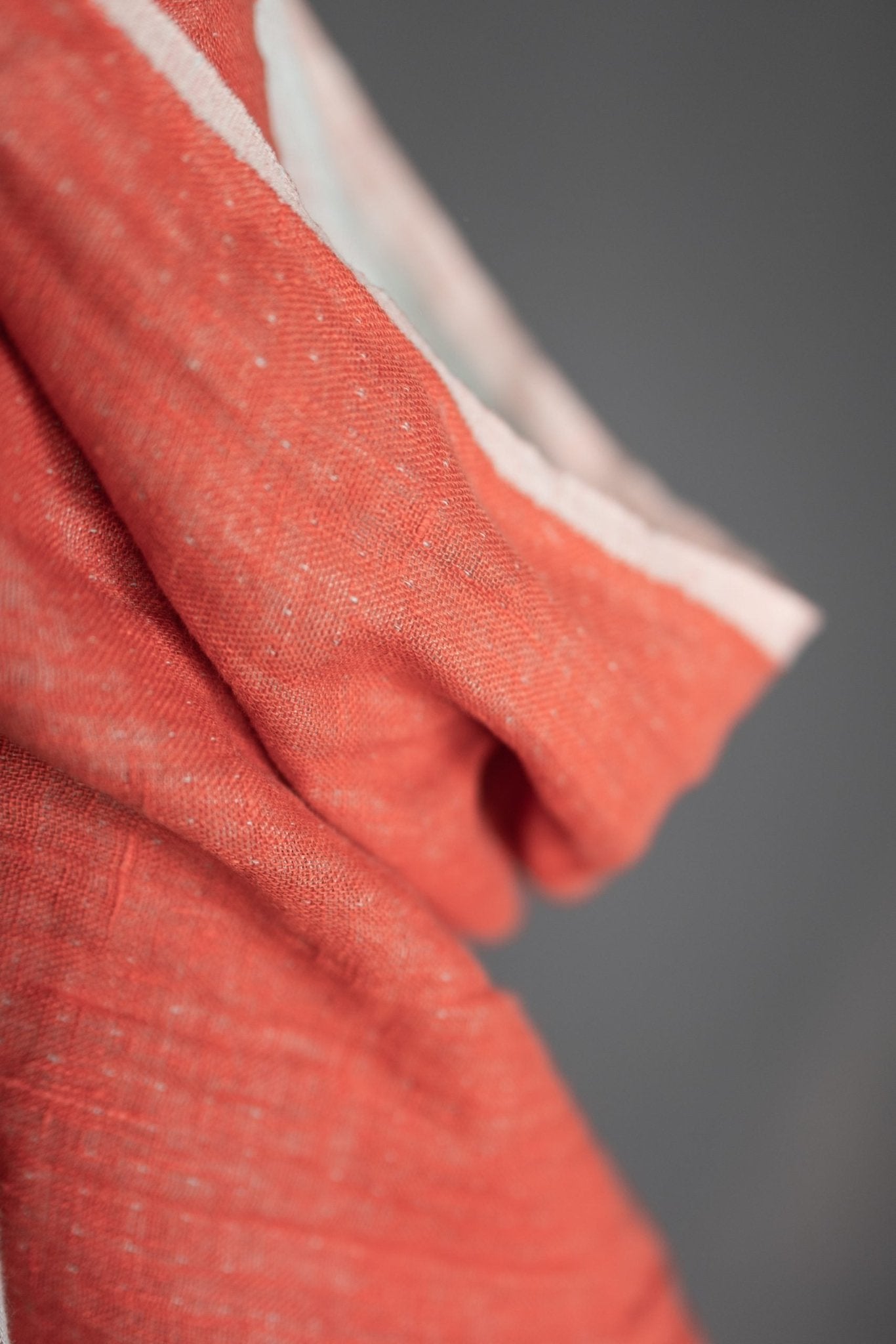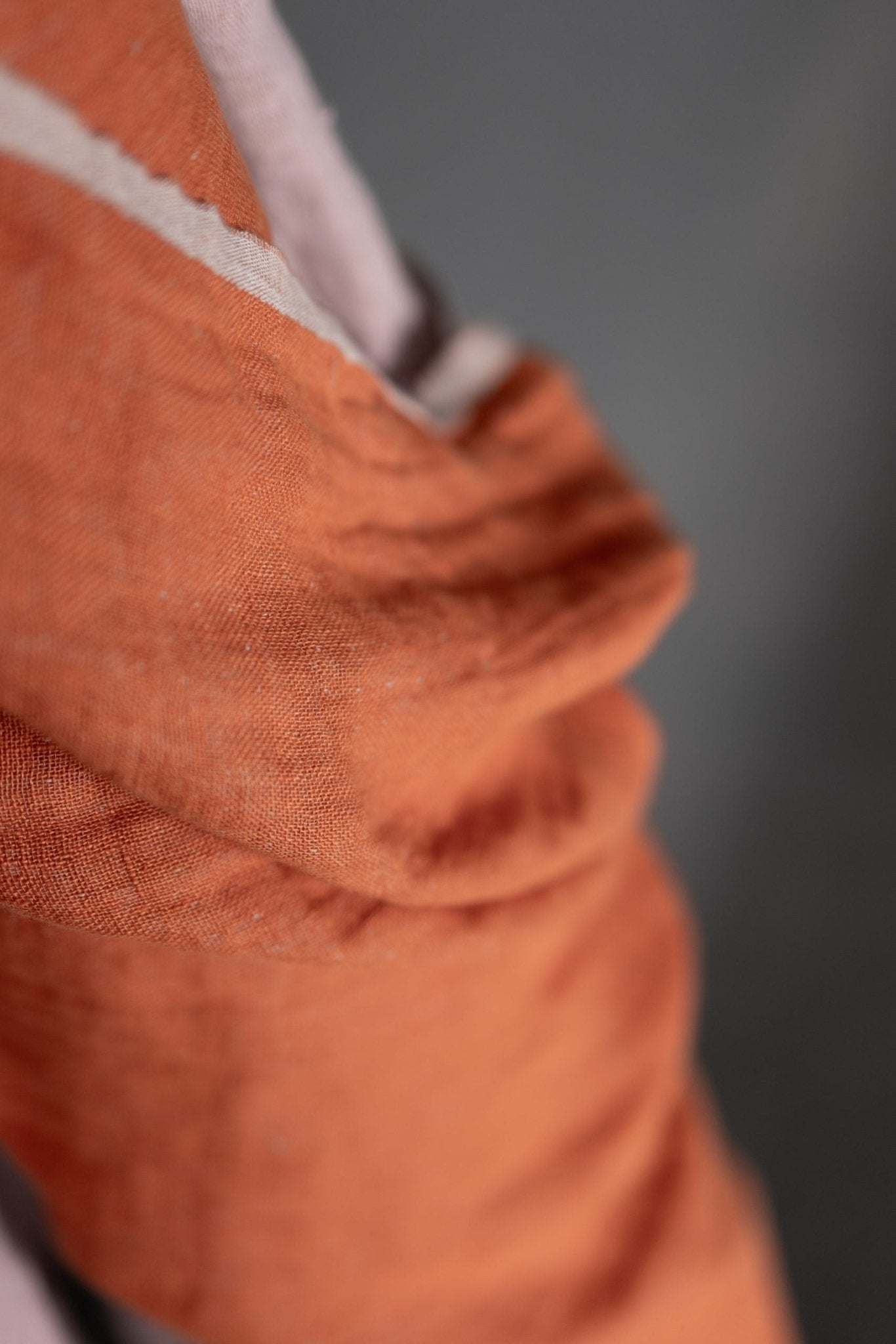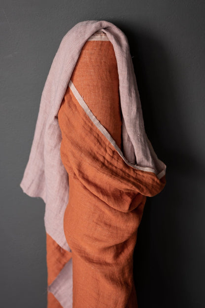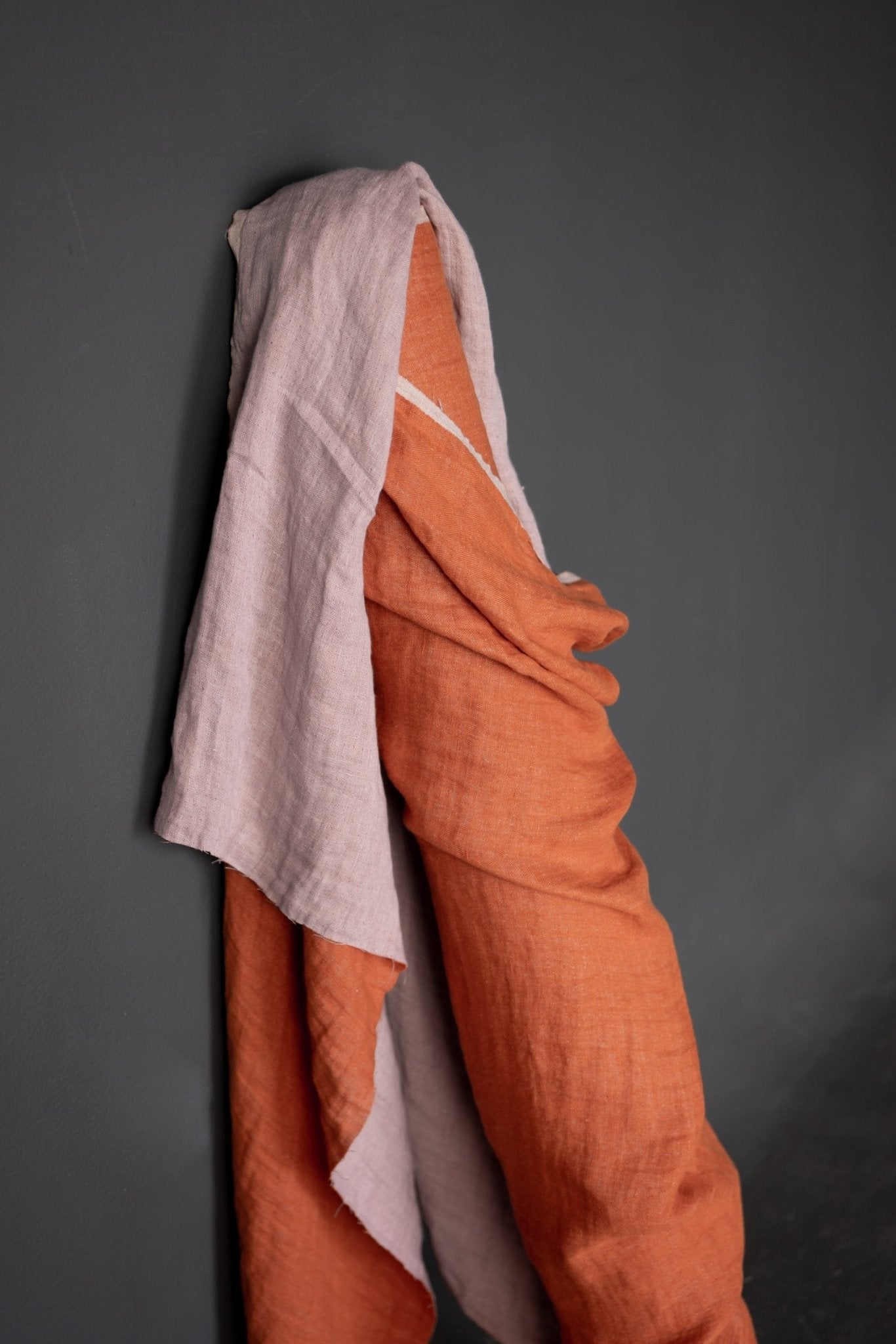 A linen double gauze of light pink on one side and a orange on the other. Tumbled at the mill for softness, this fabric would be beautiful for dressmaking as well as for soft furnishings like cushions and throws.