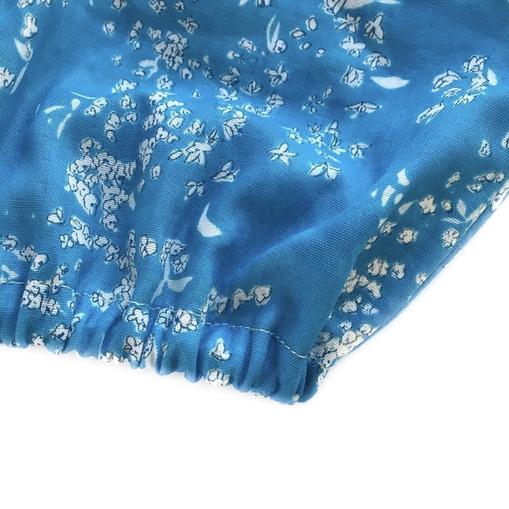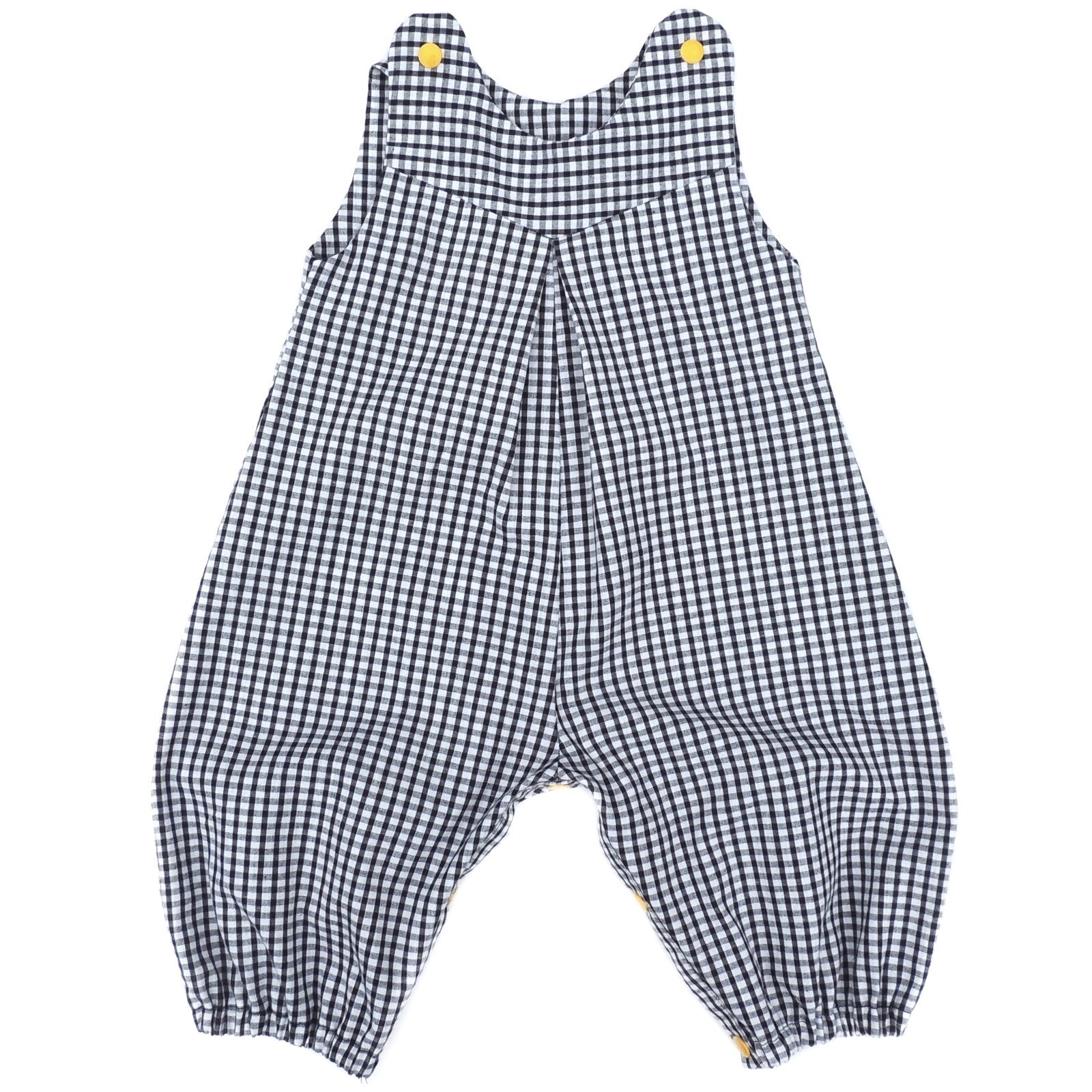 The pattern was designed to have poppers (snap fasteners) on the shoulders and leg inseam for easy access. It also features a front V shaped yoke, inverted front pleat detail, all-in-one sleeve and neckline facings and elasticated hems.