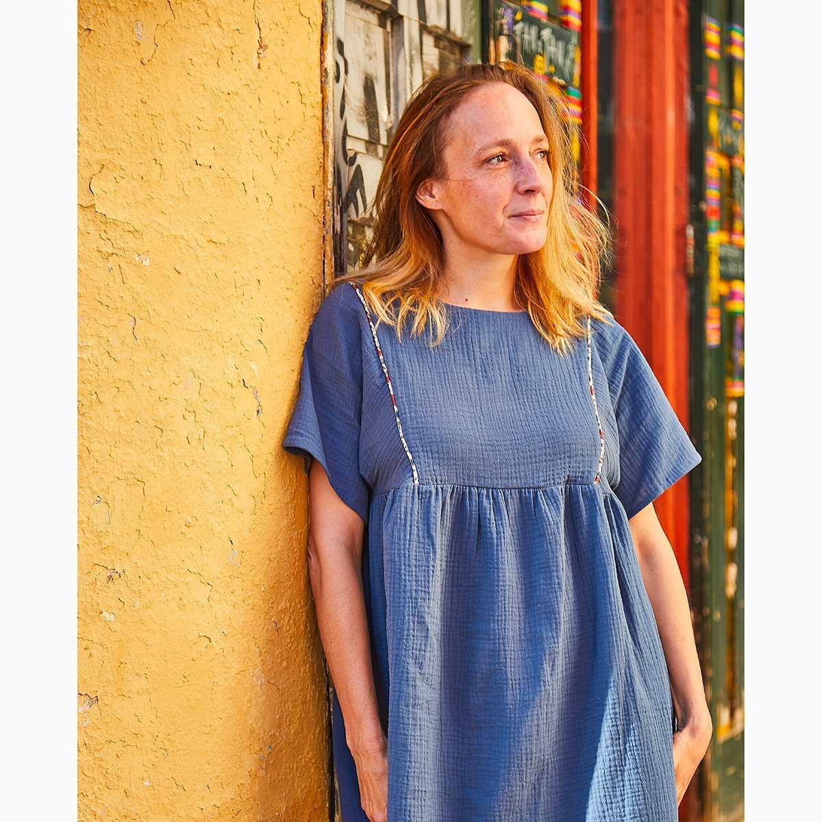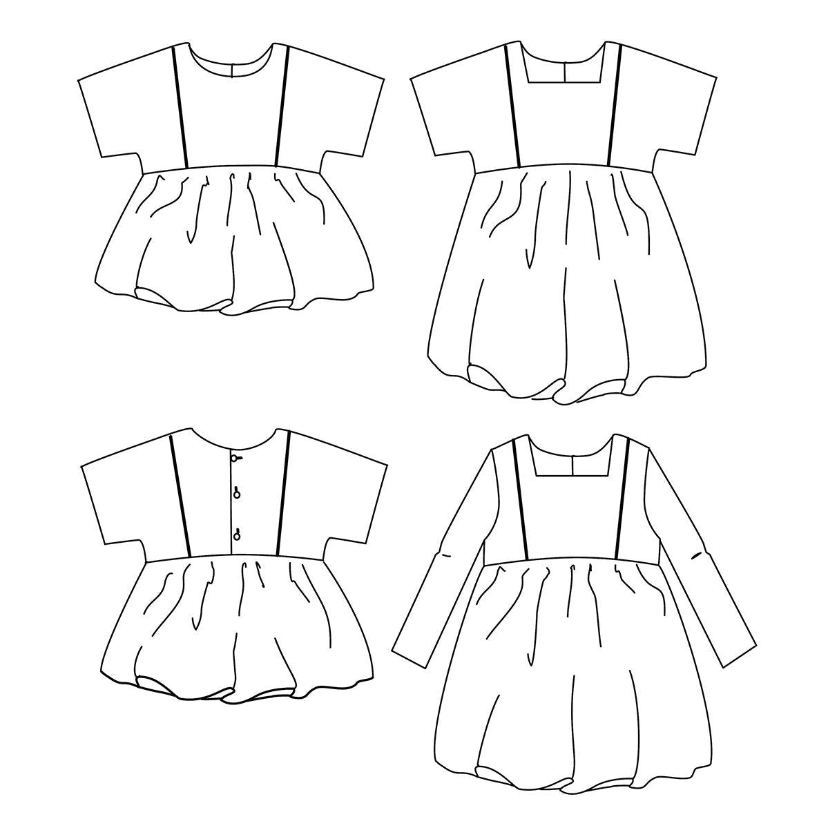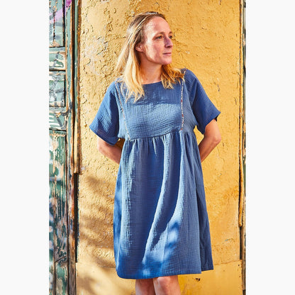 Blouse or dress. Loose fit, many options. 2 lengths: blouse or dress above the knee. Necklines: round or square. Short sleeves or long sleeves. Faced yoke with optional lace, piping or ladder hemstitch band. French seams on the sides and under the sleeves.
