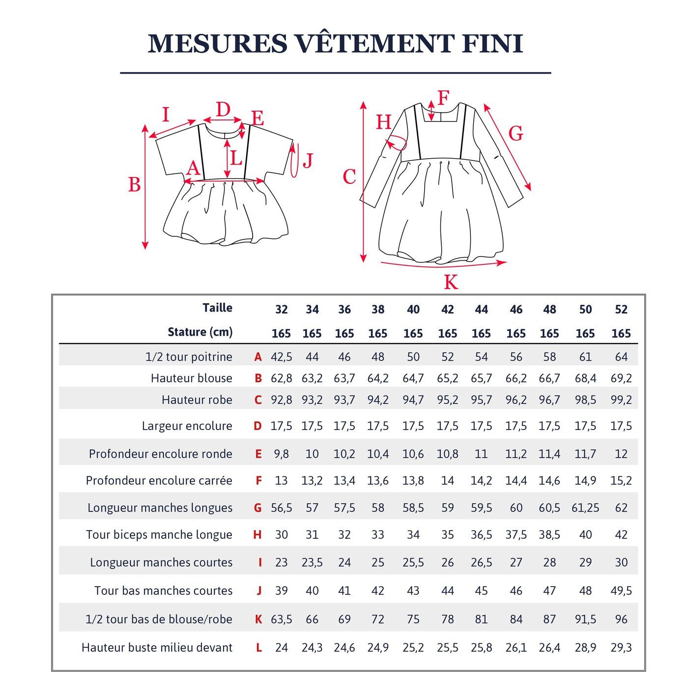 Sizes (French sizing) 32 34 36 38 40 42 44 46 48 50 52