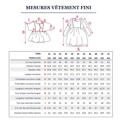 This pattern is offered from size 32 to 52 for an average stature of 165 cm. The size 32 corresponds approximately to a 14 years, the size 34 rather to a 16 years. It is recommended that you first take your measurements and choose the most suitable pattern size. If you hesitate between 2 sizes, it is preferable to choose the one you take in the store.