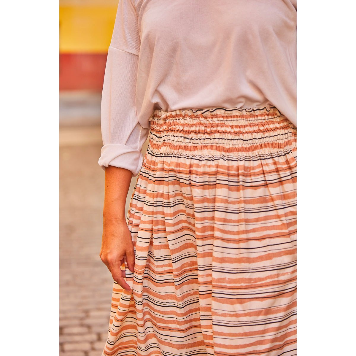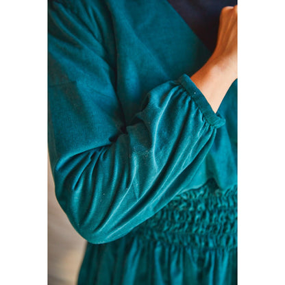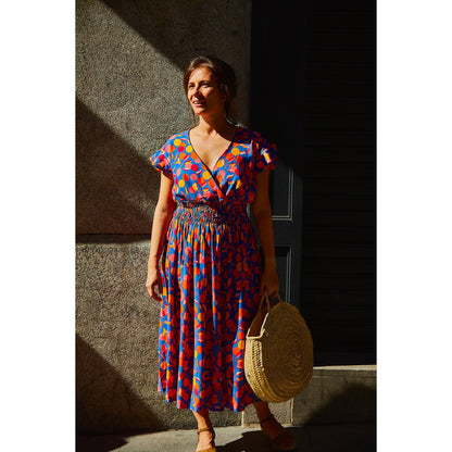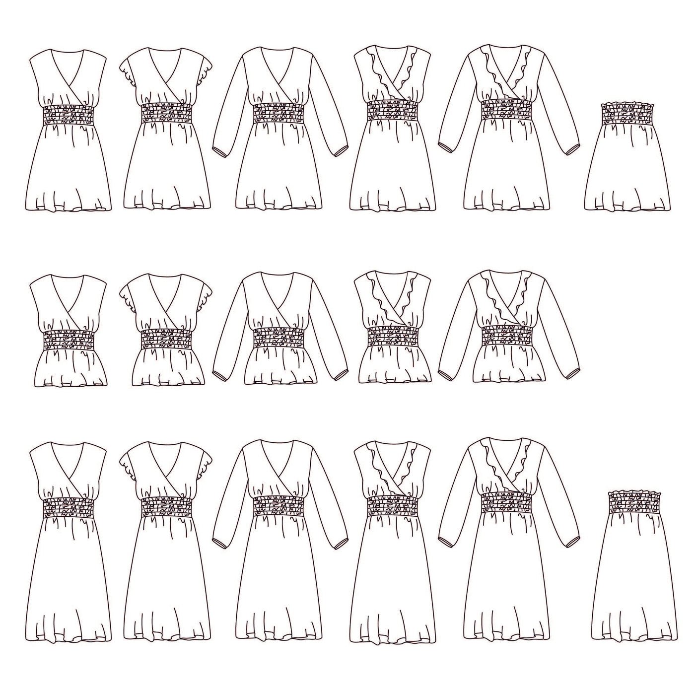 Dress, blouse or skirt with smocked elasticated waist. 3 lengths: blouse (half hips), short (above the knee) or long dress or skirt. 3 types of sleeves: long (7/8th, wide with band at bottom), ruffled sleeve or sleeveless. Loose ant and crossed front bust Finishes with lined bust. Optional flounce at the neckline. Pattern with multiple versions, adapted to all seasons