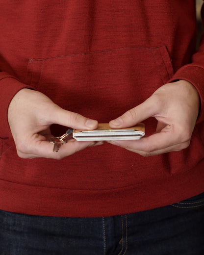 Sew a wallet that is as minimalist as they come! This elastic wallet can expand to fit up to ten cards within its three elastic pockets but will also snugly carry as little as two cards and some cash. Personalise this wallet with colourful elastic and a contrast cash pocket made from leather, Kraft-tex, Tyvek or felt. Add an optional tag and key ring so the wallet may be attached to keys, a lanyard or secured within a bag.
