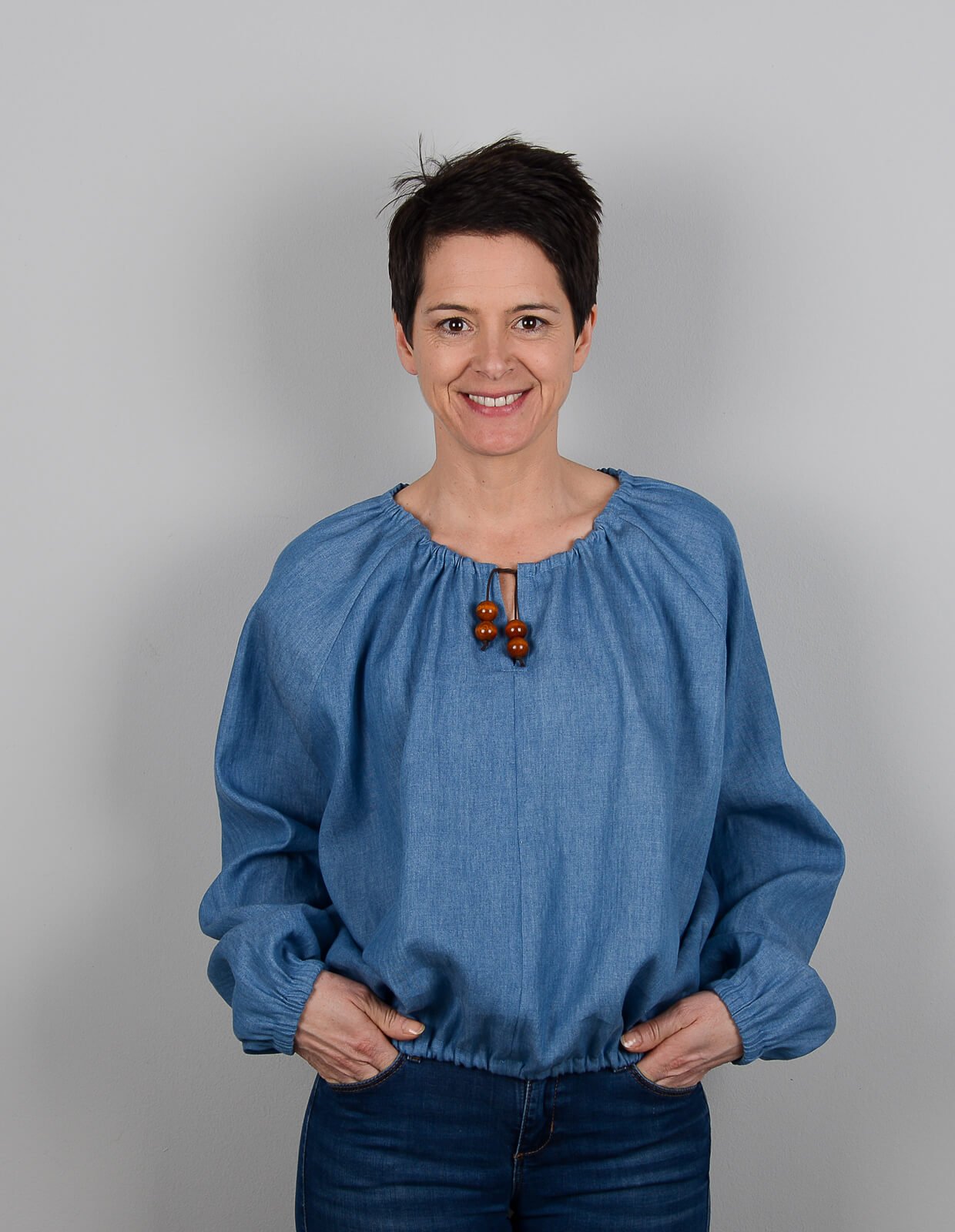 This is a classic summer style with options for a dress or blouse with raglan sleeves and a drawstring neckline. This pattern has options for long or bracelet length sleeves, with or without gathered cuffs.