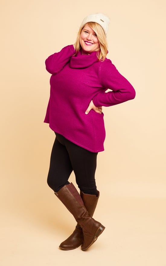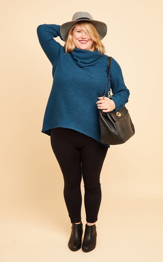 Cozy up with the Tobin Sweater! This modern sweater pattern is designed for curves, with cup sizes from C – H and bodice darts, so you can get a fantastic fit at the bust as well as the rest of your body.