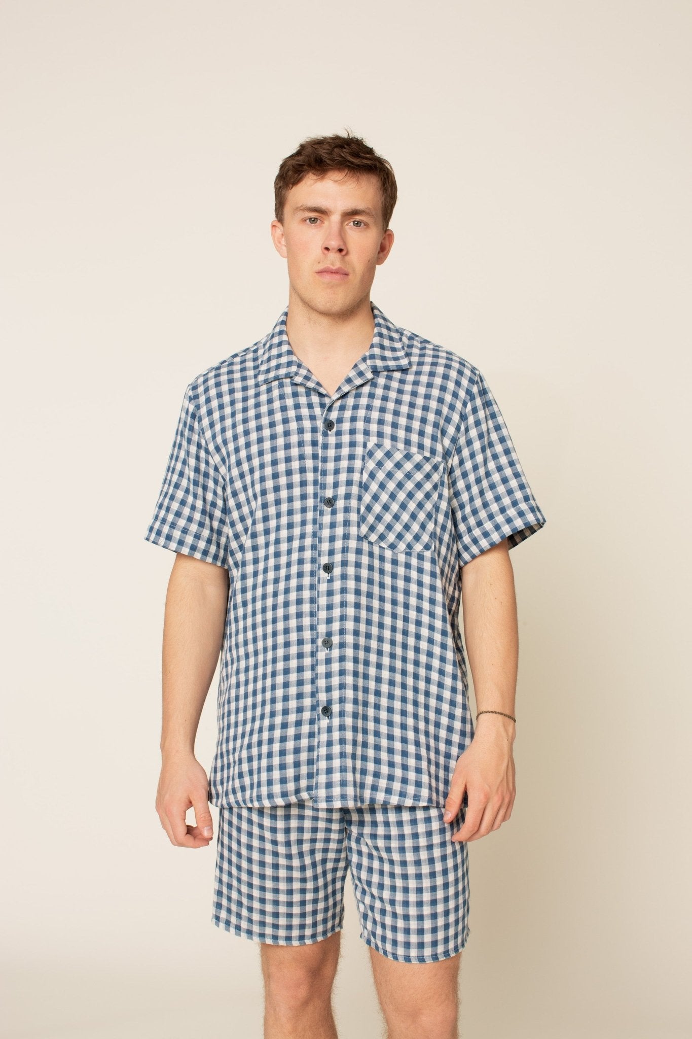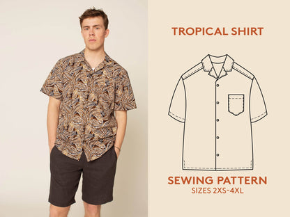 Discover the Men's Tropical Shirt Sewing Pattern from Wardrobe by Me. This casual button-up shirt features a stylish short-sleeved design with a convertible collar, perfect for your summer wardrobe. This pattern is ideal for sewing enthusiasts looking to create comfortable yet fashionable clothing.