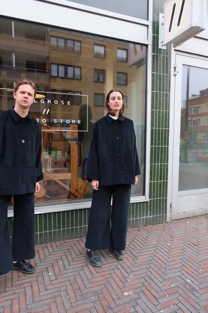 This is an oversized workwear style jacket made using Zero Waste Pattern Cutting. It has a collar and a dropped shoulder. Comes with 2 pocket options. Jacket has side splits, front button closure, shoulder darts on front and back shoulders for shaping and back gathers on the sleeve hem with a roll up cuff.